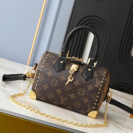 A bold reimagining of a classic design, the Speedy Trunk bag was unveiled at the Cruise 2025 show in Monogram jhaki canvas with Monogram Reverse trim, a signature Nicolas Ghesquiere brushstroke, and dazzling metal pieces that pay homage to the brand's heritage of trunk-making. With a detachable shoulder strap and chain, it can be worn cross-body, over the shoulder or in the hand. Dimensions: 20.5 × 16 × 11 cmTranslated with www.DeepL.com/Translator (free version)