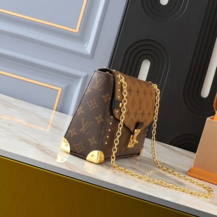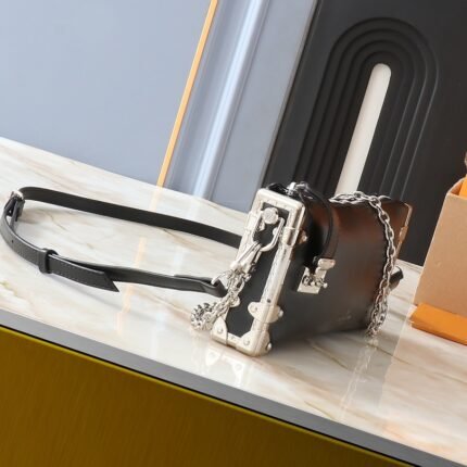 Inspired by Louis Vuitton’s traditional hard case, the Slim Trunk is made from supple cowhide leather with studded edges and a metal S-lock closure for an edgy, rock ‘n’ roll look. leather with studded edges and a metal S-lock closure for an edgy rock ‘n’ roll look. The shiny chain The shiny chain and adjustable leather shoulder strap are removable, offering a variety of carrying options. Dimensions: 23 x 12 x 4 cm (L x H x W)