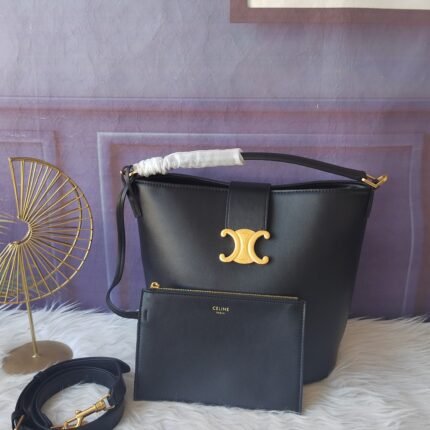 Celine black bucket bag with gold finish, hand-held, shoulder and crossbody, leather flip cover, equipped with TRIOMPHE magnetic buckle, 1 internal detachable zipper pocket, size 28cm-24cm-16cm