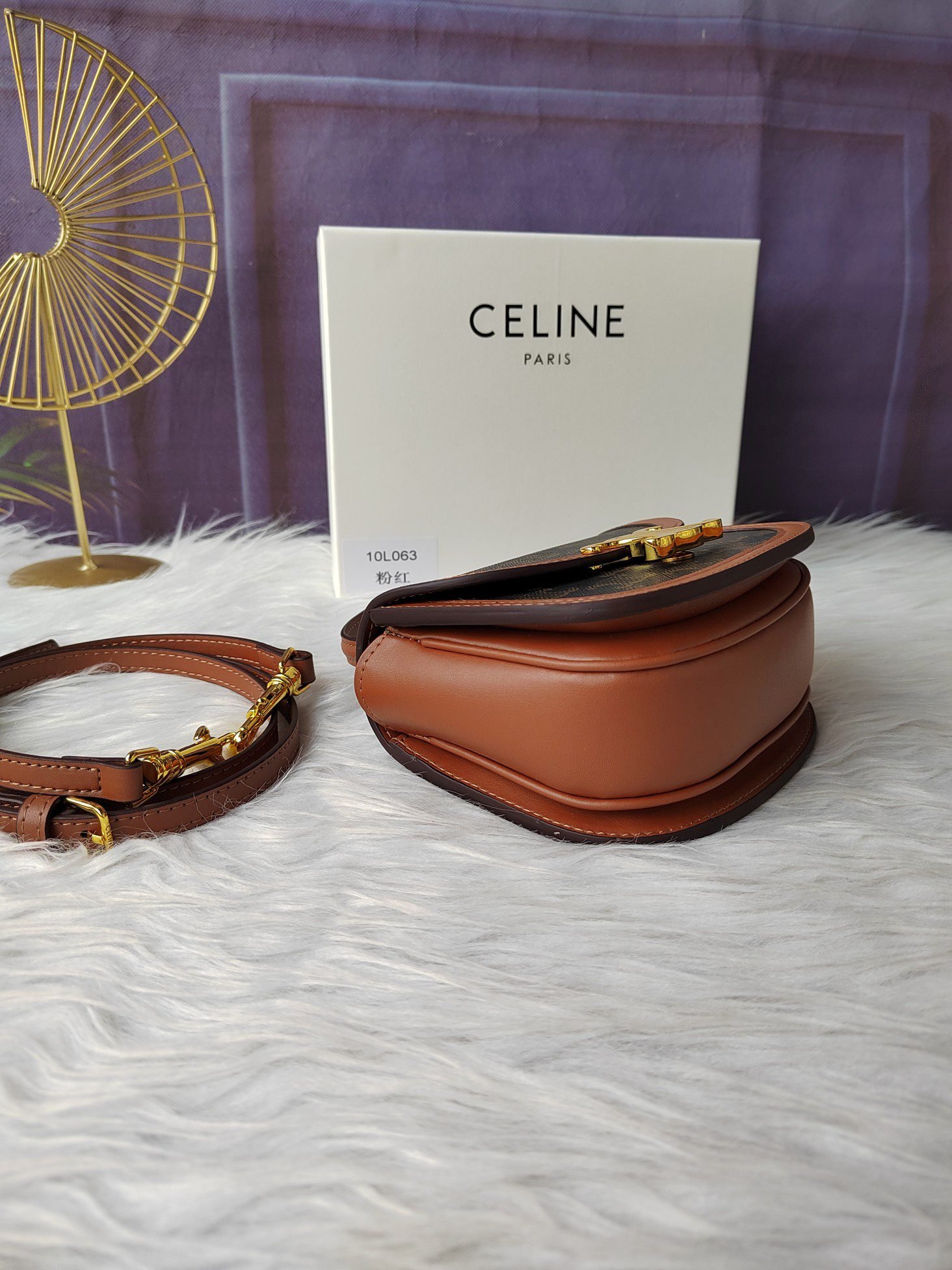 Celine brown bucket bag with gold finish, hand-held, shoulder and crossbody, leather flip cover, equipped with TRIOMPHE magnetic buckle, 1 internal detachable zipper pocket, size 28cm-24cm-16cm