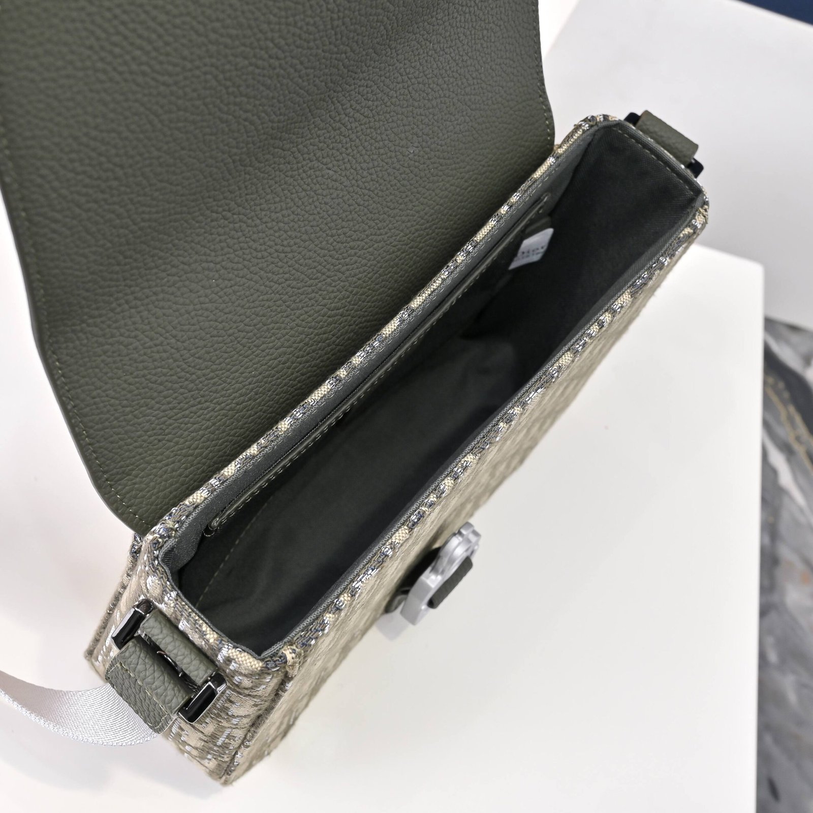 Metallic Oblique print, dark grey grain leather with Dior logo on the inside, flip closure, aluminum buckle with Christian Dior logo and CD initials, detachable and adjustable leather shoulder strap, size: 24x 17x 5.5 cm