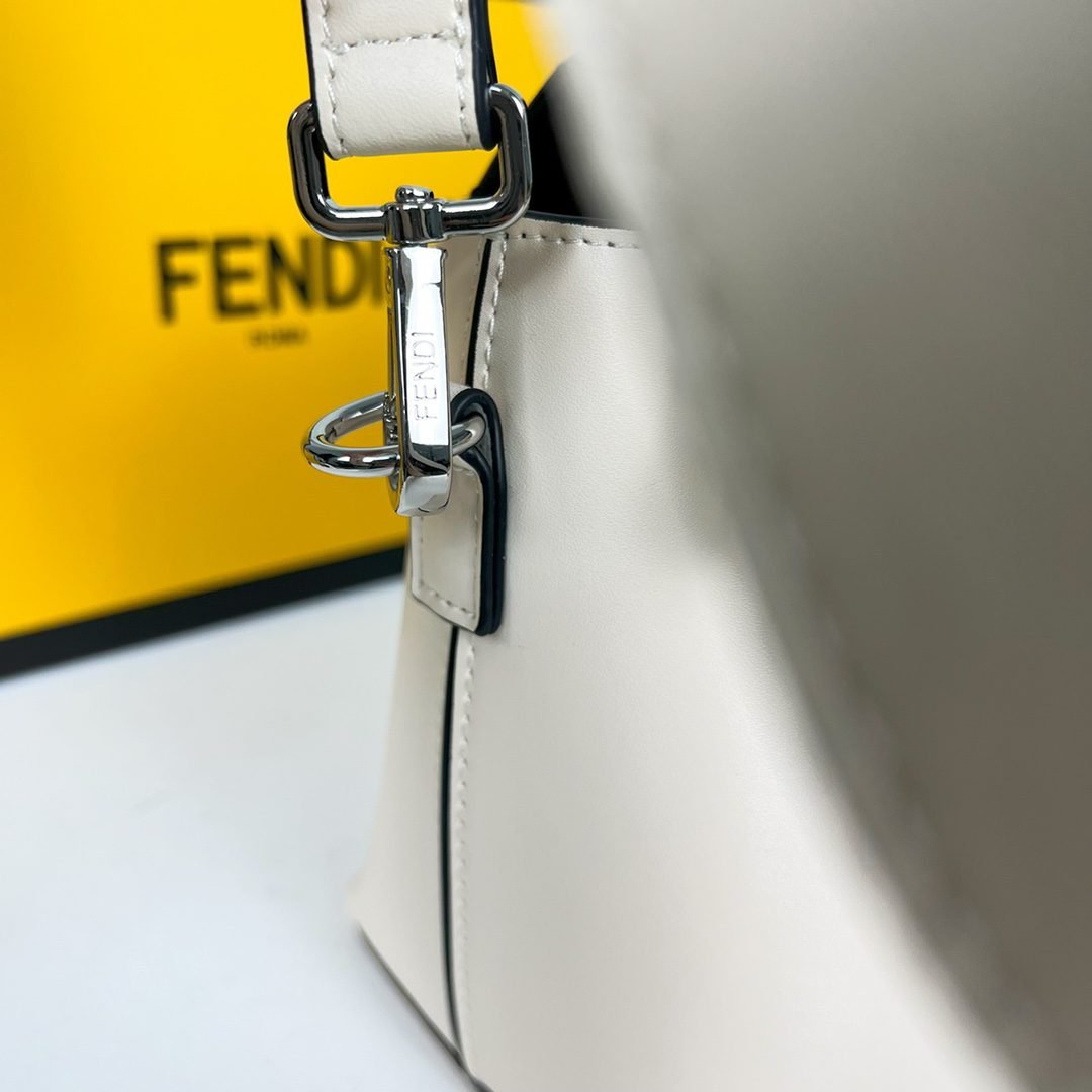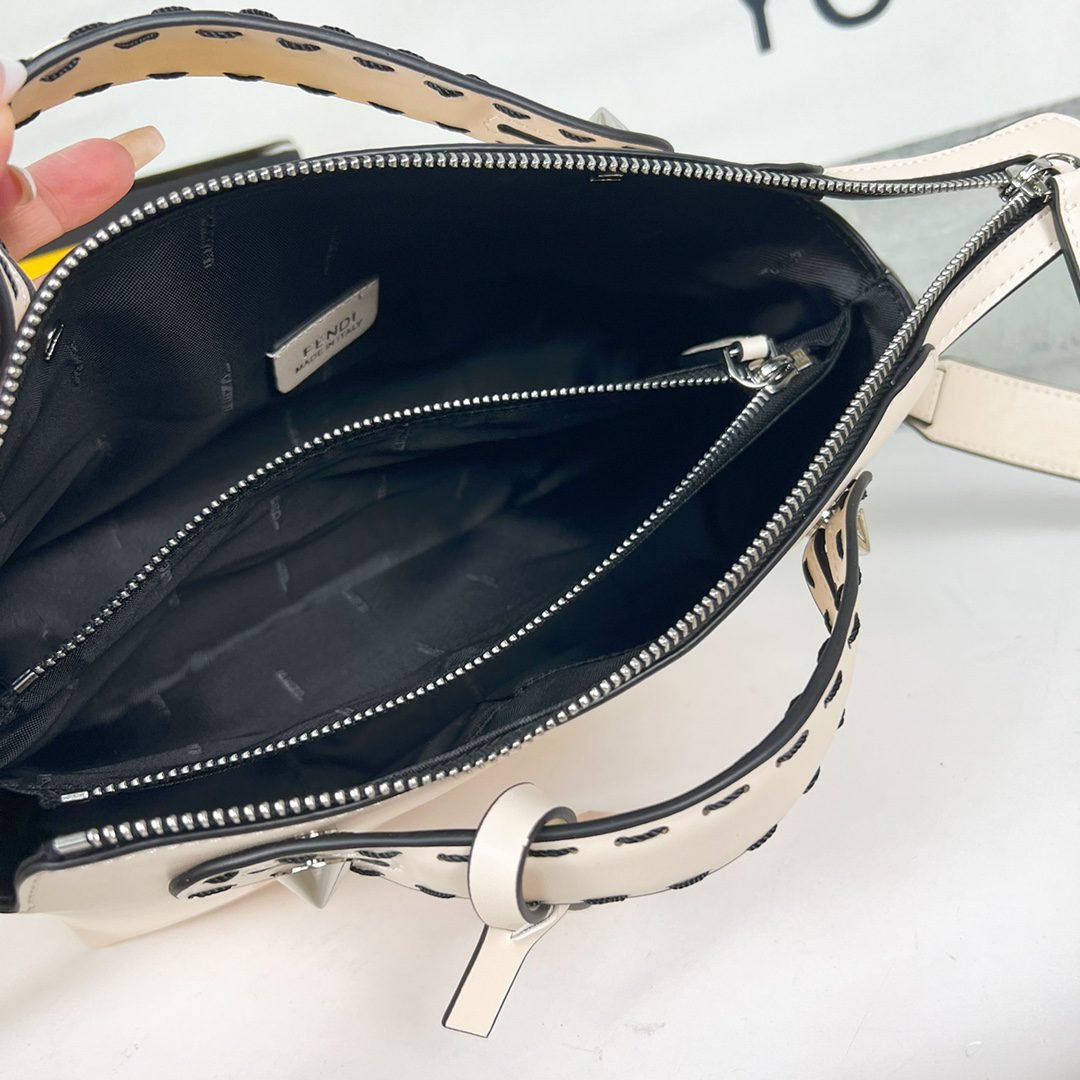 Fendi Praphy Underarm Bag, featuring a crescent shaped design, with the classic metal logo [FENDI] decorated at the bottom of the bag. The contour of the bag is very close to the body's lines, making it fashionable when carried under the armpit. The size is 29x24.5x10cm