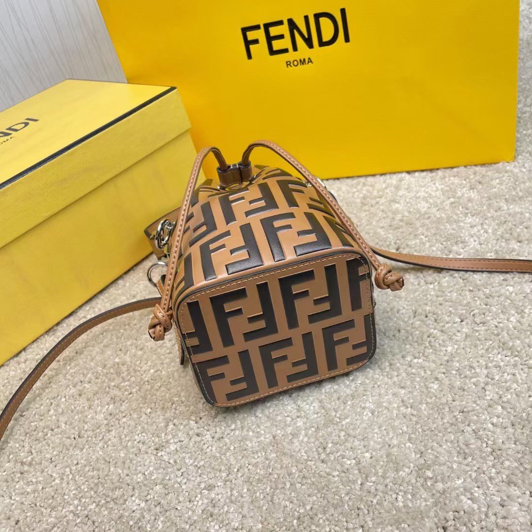 Mon Tresor small bucket handbag with drawstring and Fendi metal logo decoration. Two detachable shoulder straps, one long and one short, can be worn on one shoulder or crossbody. Made of calf leather material. Gold metal accessories. Size 12 * 10 * 18cm