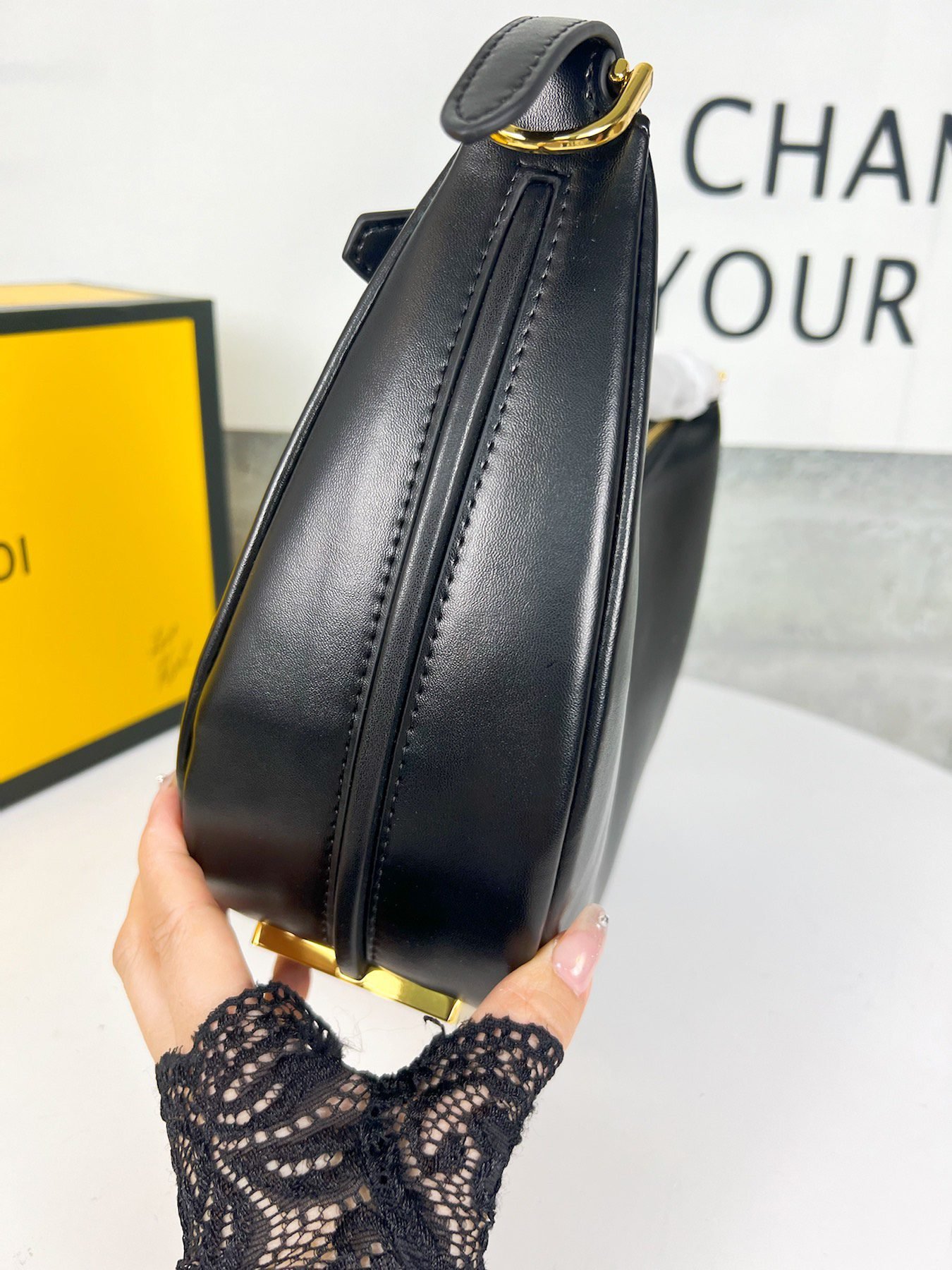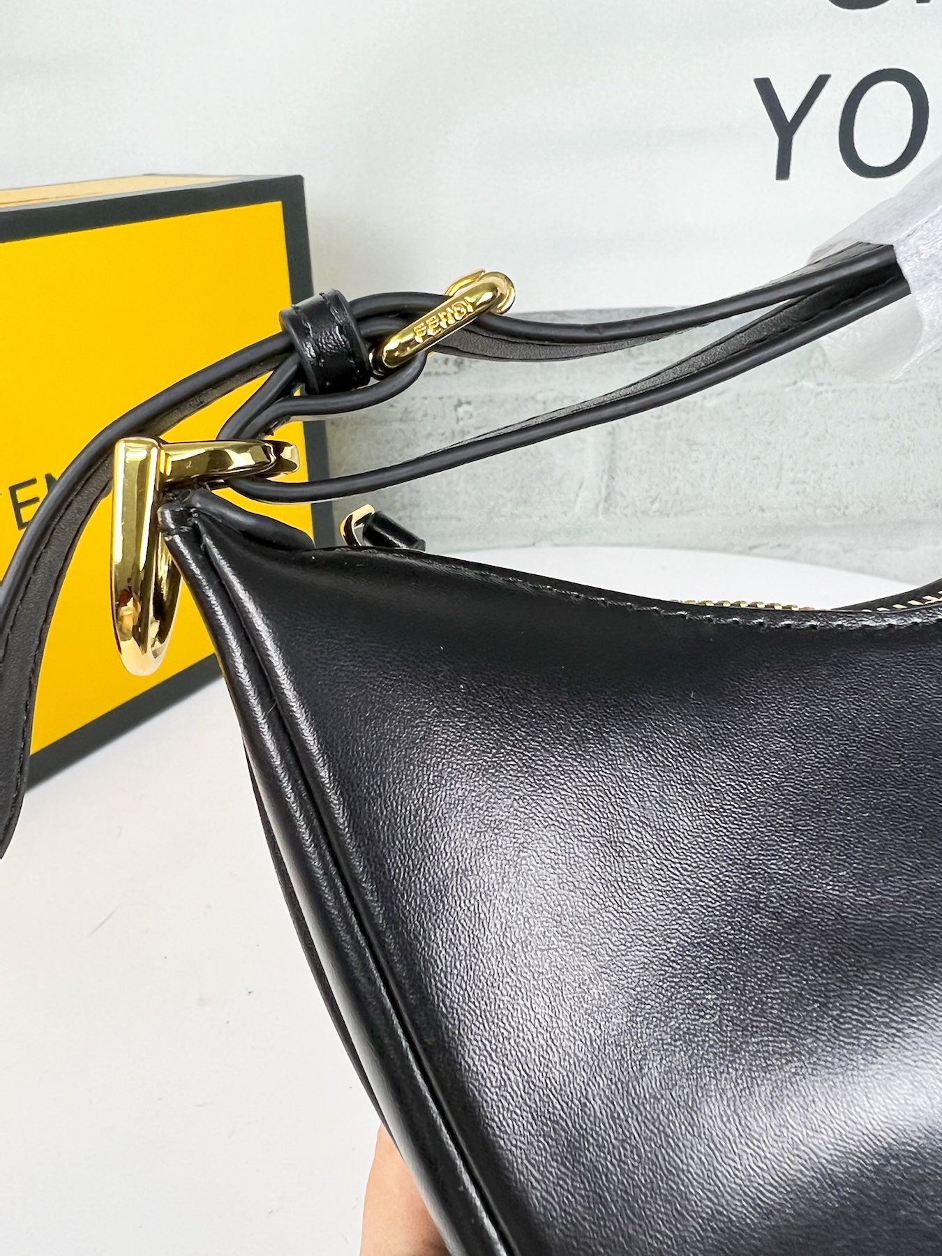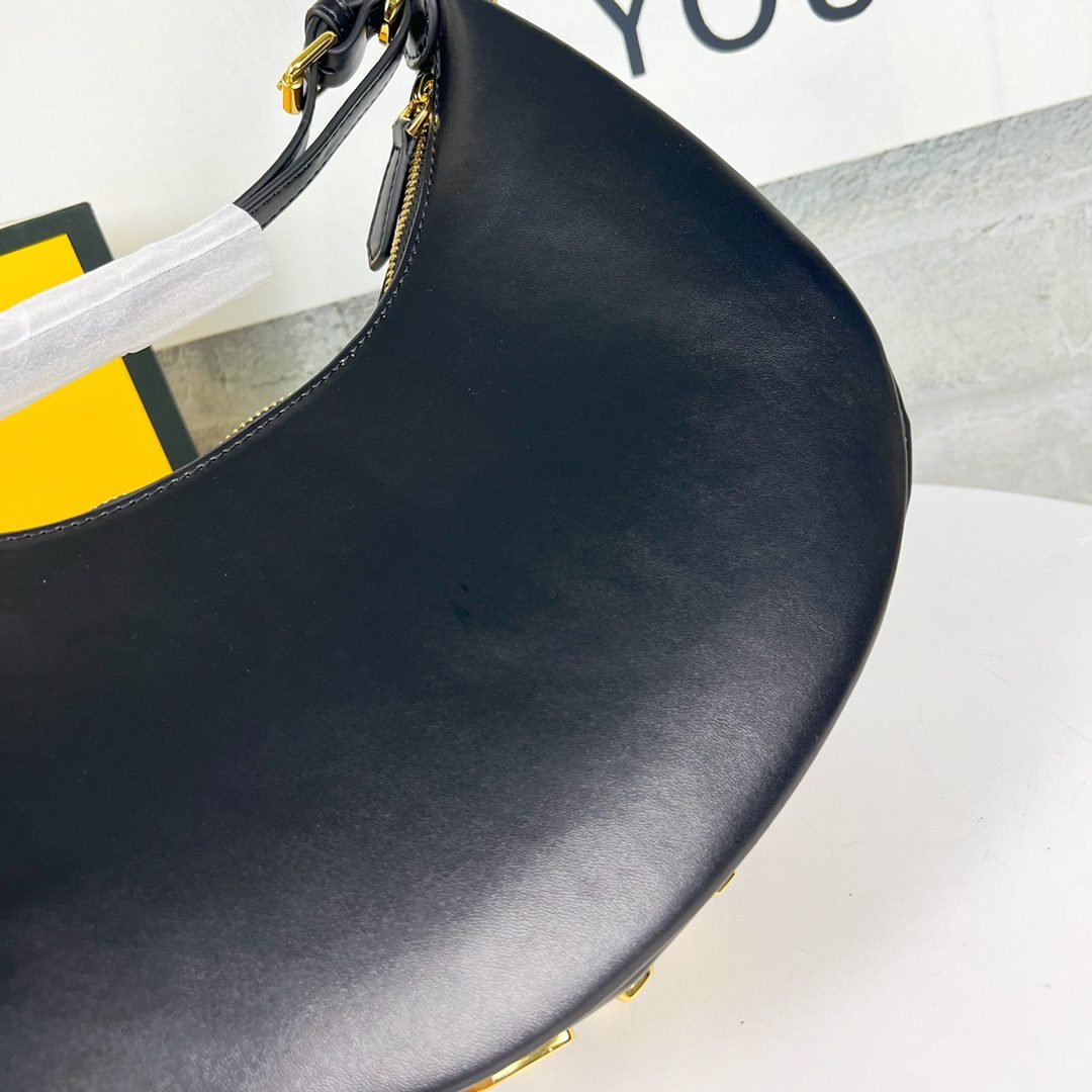 Fendi Praphy Underarm Bag, featuring a crescent shaped design, with the classic metal logo [FENDI] decorated at the bottom of the bag. The contour of the bag is very close to the body’s lines, making it fashionable when carried under the armpit. The size is 29×24.5x10cm