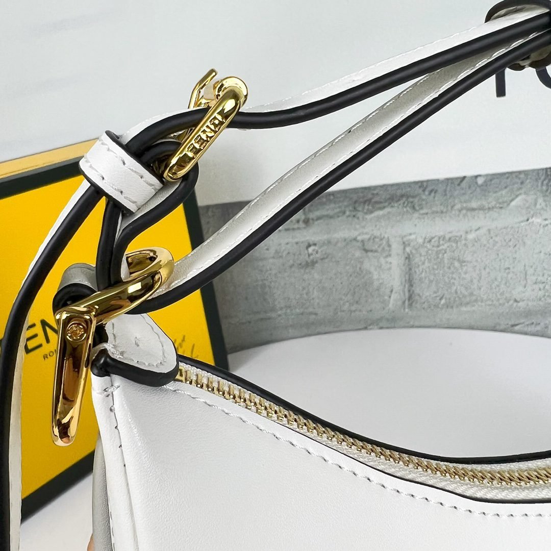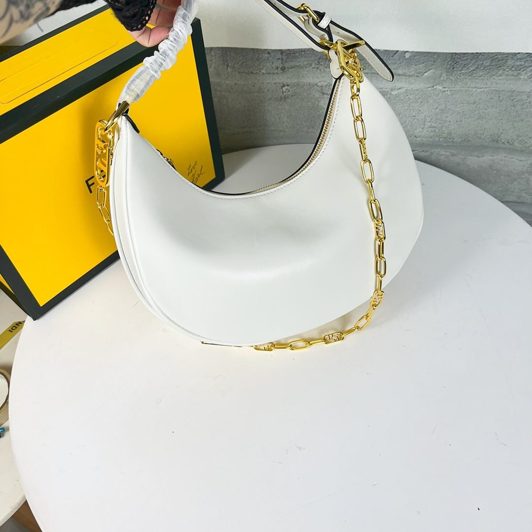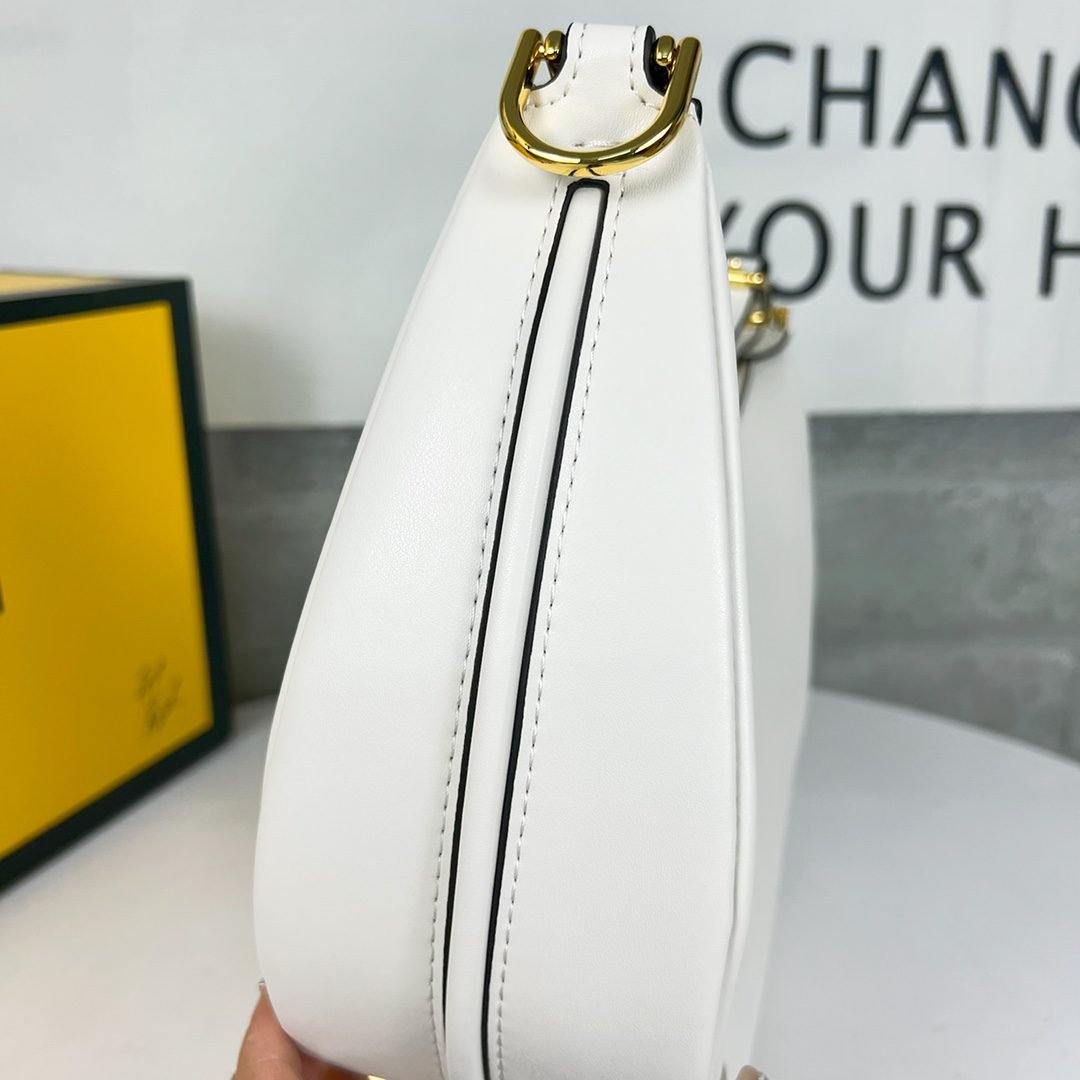 Fendi Praphy Underarm Bag, featuring a crescent shaped design, with the classic metal logo [FENDI] decorated at the bottom of the bag. The contour of the bag is very close to the body’s lines, making it fashionable when carried under the armpit. The size is 29×24.5x10cm