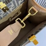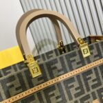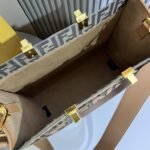 Sunshine fabric medium-sized tote bag with brown FF jacquard pattern and light brown leather “FENDI ROMA” lettering, featuring a hard handle. Featuring spacious interior compartments with light brown leather edges. It can be held with dual handles, and two internal hooks can be used to secure the shoulder strap.