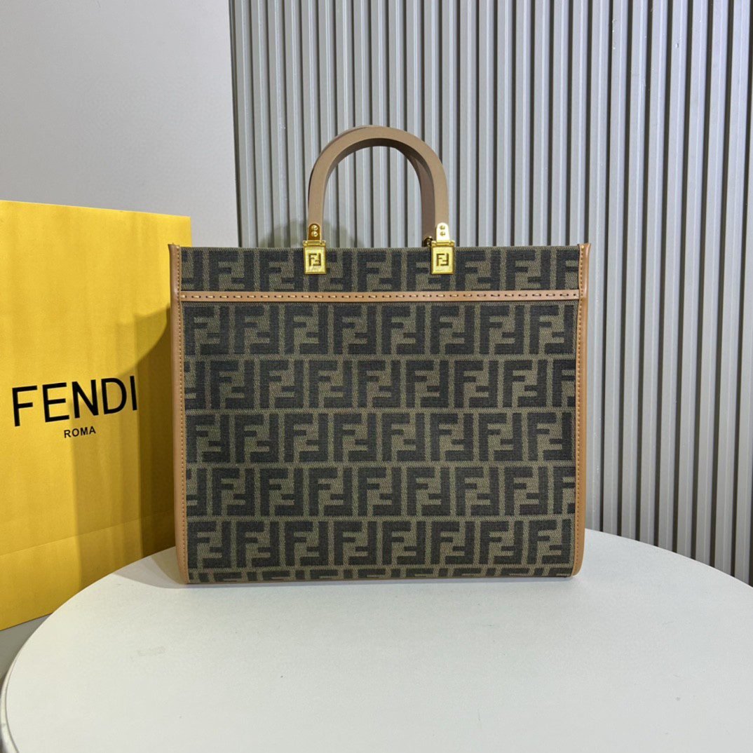 Sunshine fabric medium-sized tote bag with brown FF jacquard pattern and light brown leather "FENDI ROMA" lettering, featuring a hard handle. Featuring spacious interior compartments with light brown leather edges. It can be held with dual handles, and two internal hooks can be used to secure the shoulder strap. Size: 35-31-17