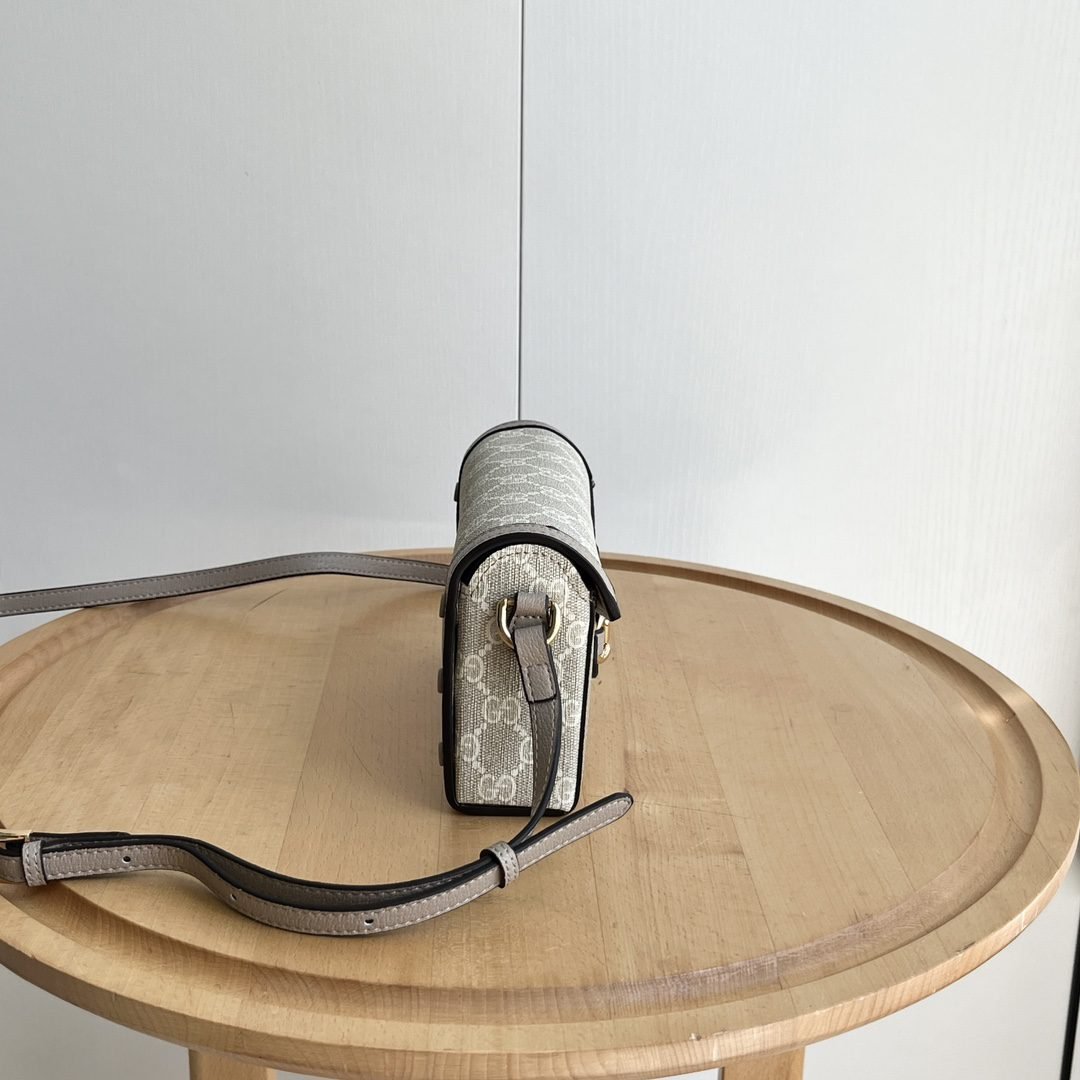 The new Horsebit 1955 series handbags embody the double-ring and elongated design that inherits the brand's equestrian roots. This small handbag is crafted from the brand-new GG canvas, featuring a unique hot embossing technique that renders exquisite patterns, creating a soft and refined touch. Dimensions: 22.6x12.7x5.6cm