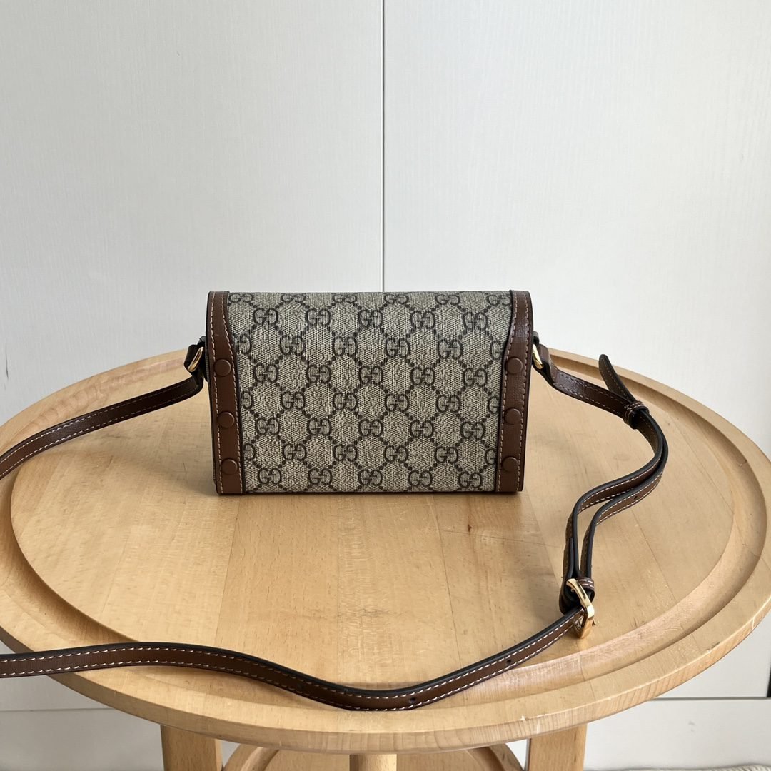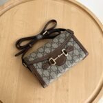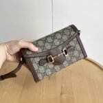 The new Horsebit 1955 series handbags embody the double-ring and elongated design that inherits the brand's equestrian roots. This small handbag is crafted from the brand-new GG canvas, featuring a unique hot embossing technique that renders exquisite patterns, creating a soft and refined touch. Dimensions: 22.6x12.7x5.6cm