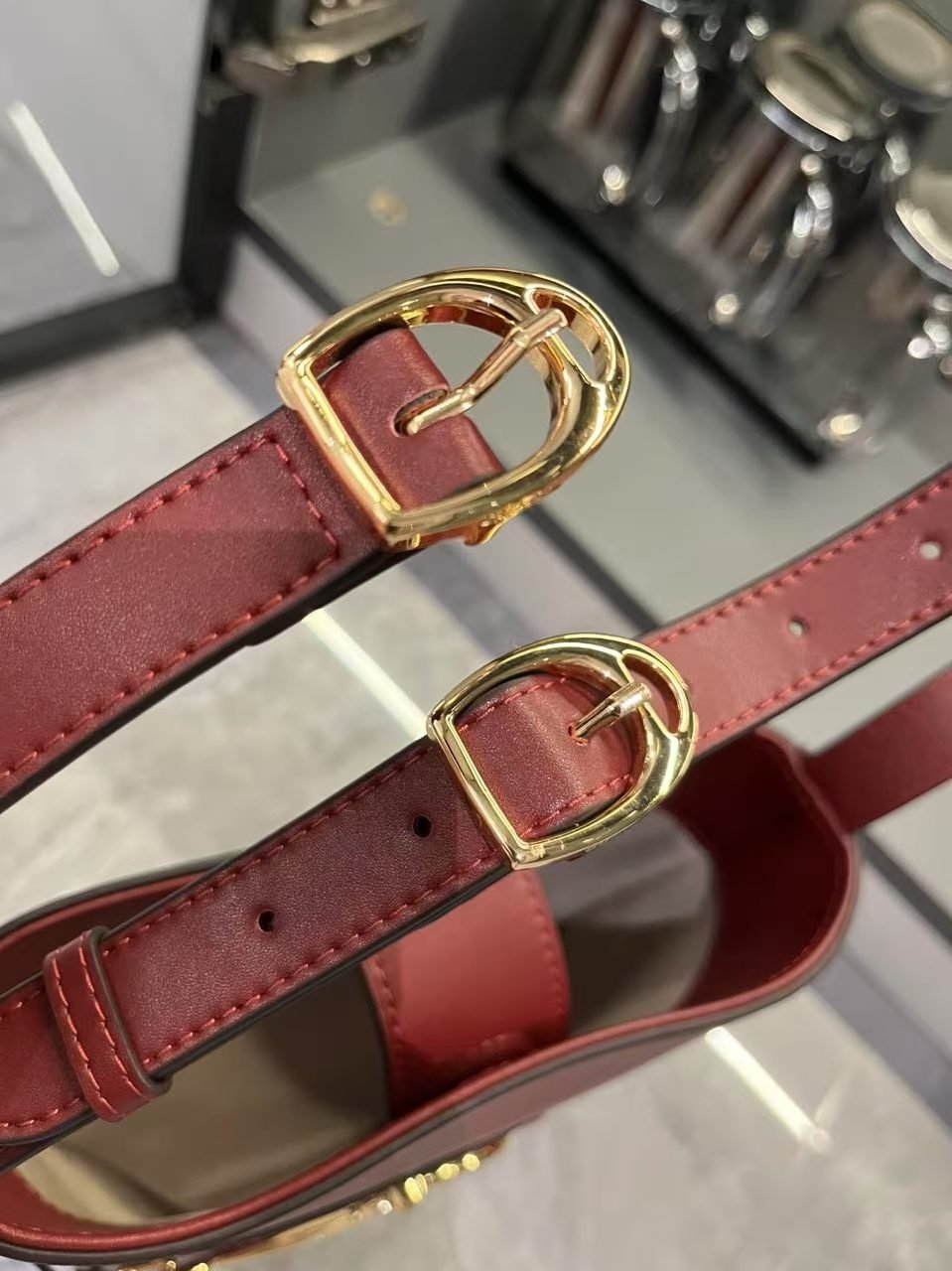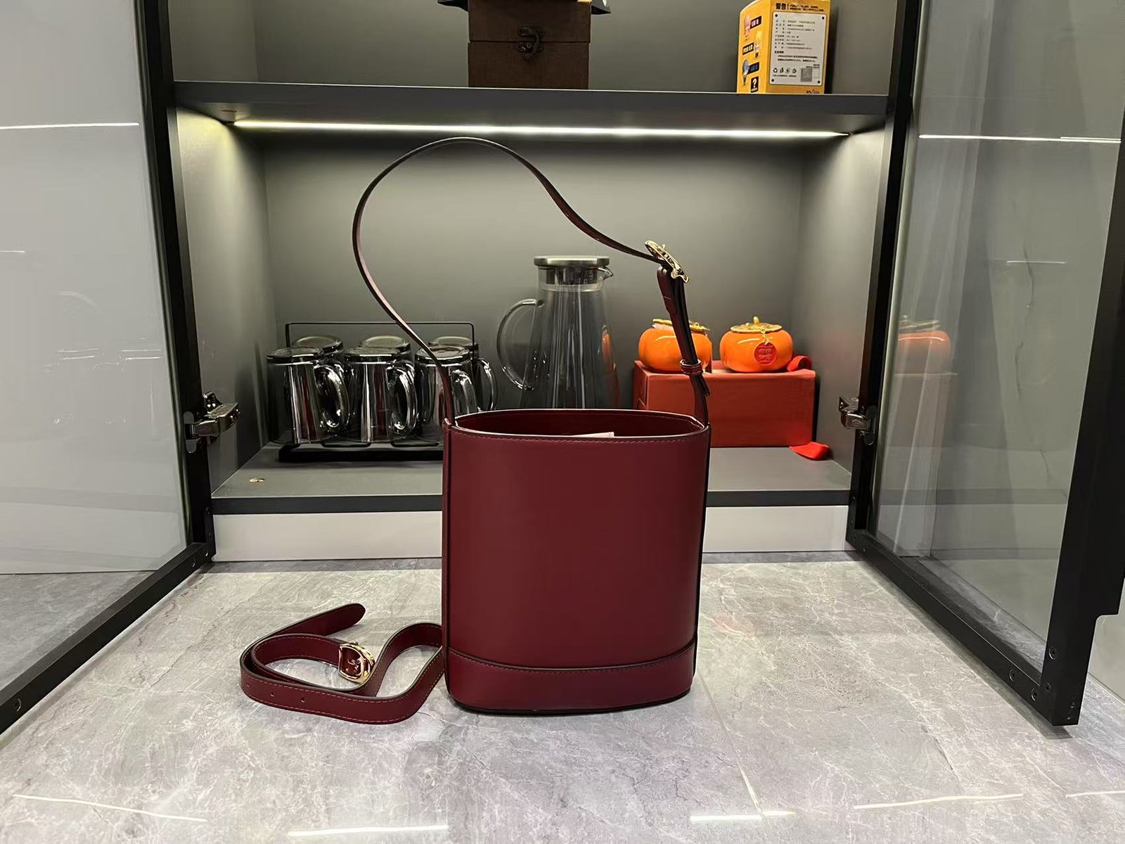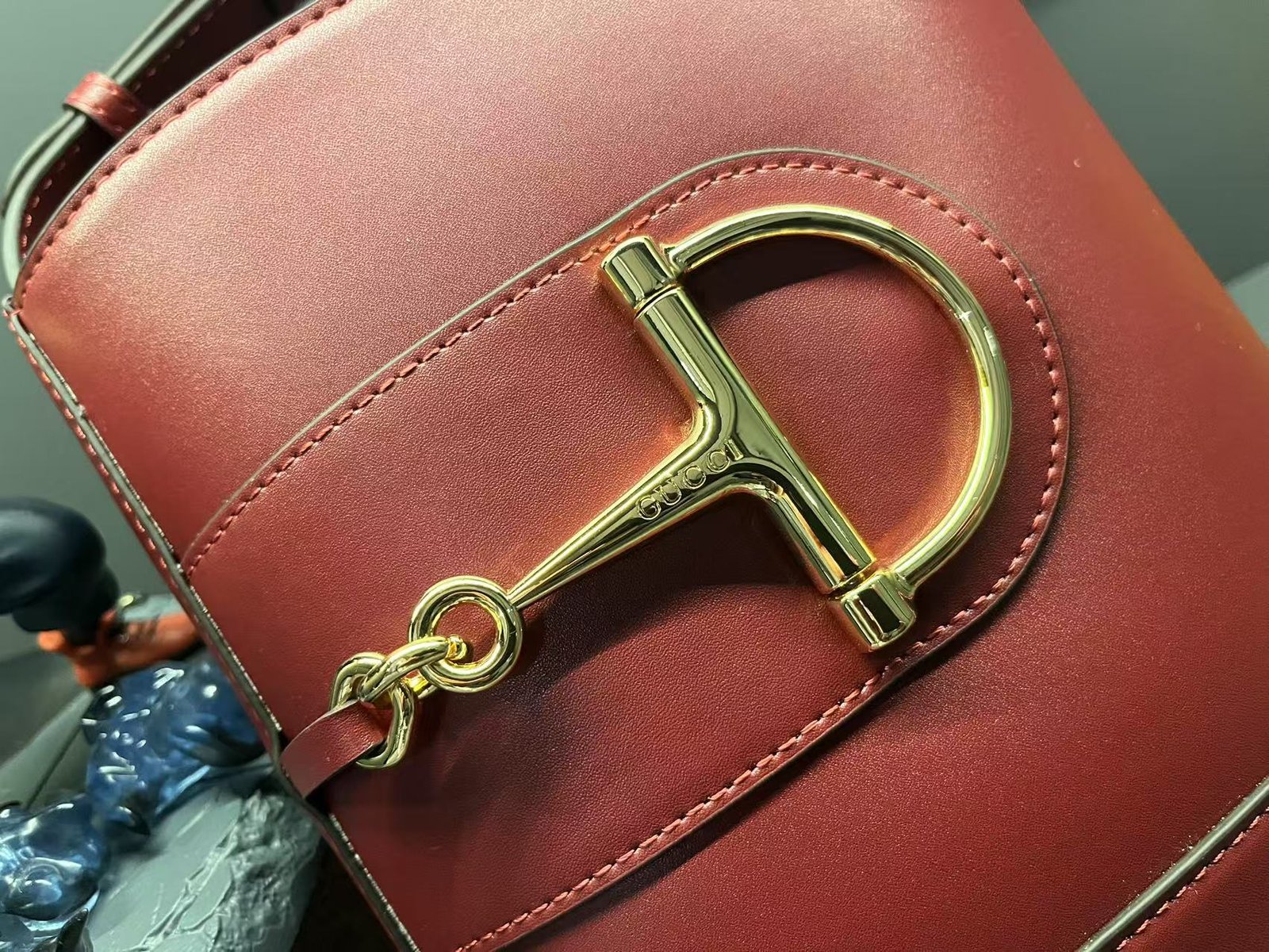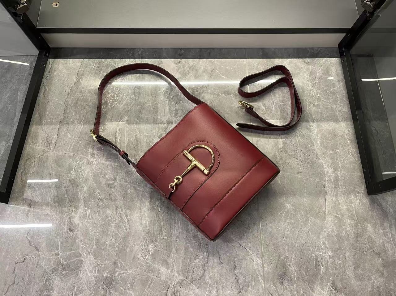 In the Spring/Summer 2025 collection, the GG73 series drew inspiration from a collector’s bucket bag launched in the same year as its collection name. This bag features a modern aesthetic interpretation of a horseneck buckle design accessory, which can be worn diagonally, over the shoulder, or as a handbag. It is made of smooth leather with a golden tone and an oversized half horseneck buckle design accessory, lined with a brown cotton linen blend.