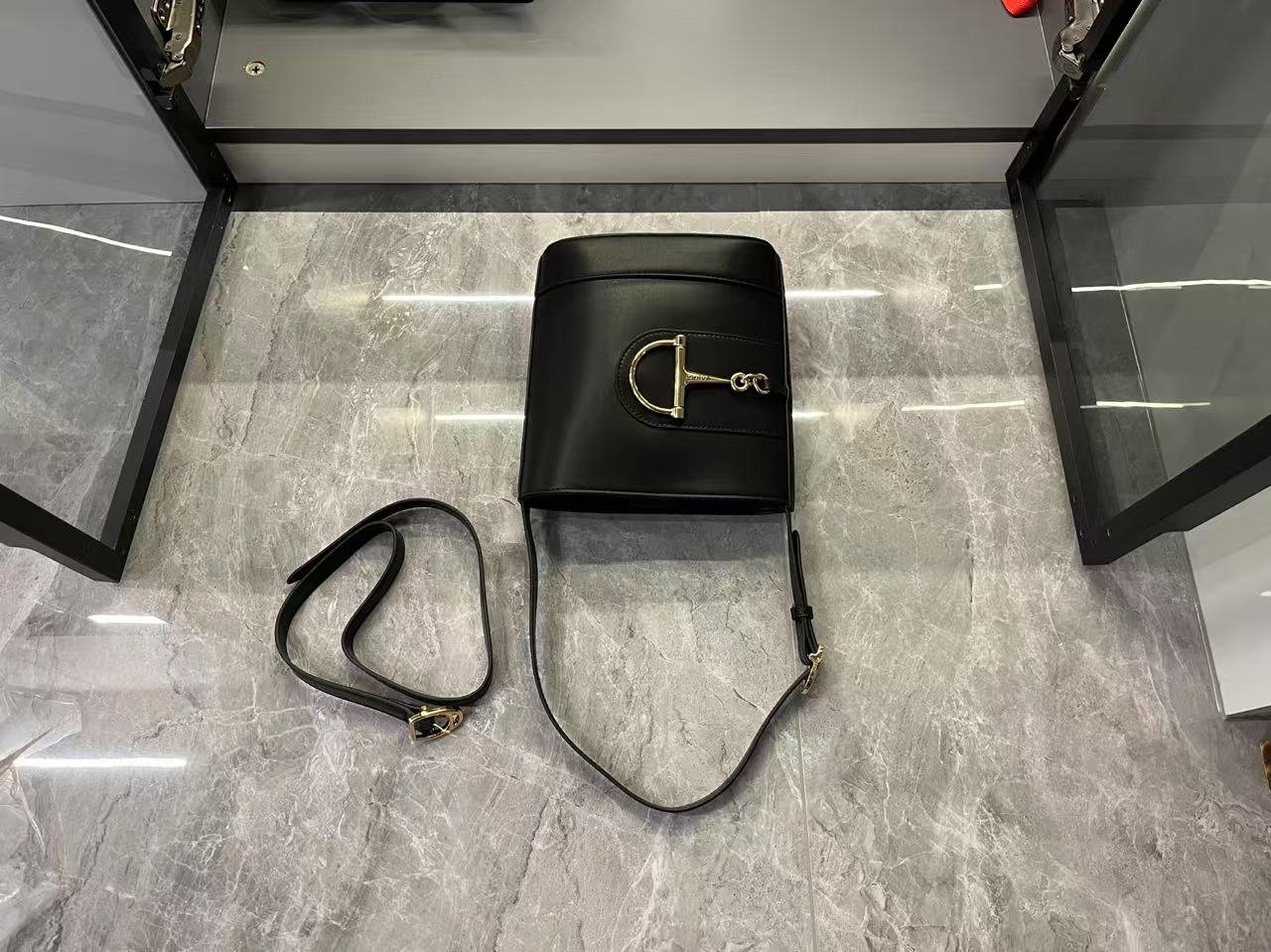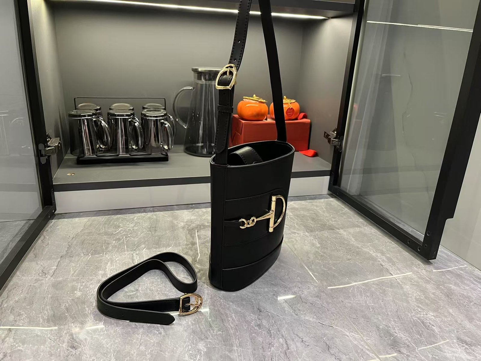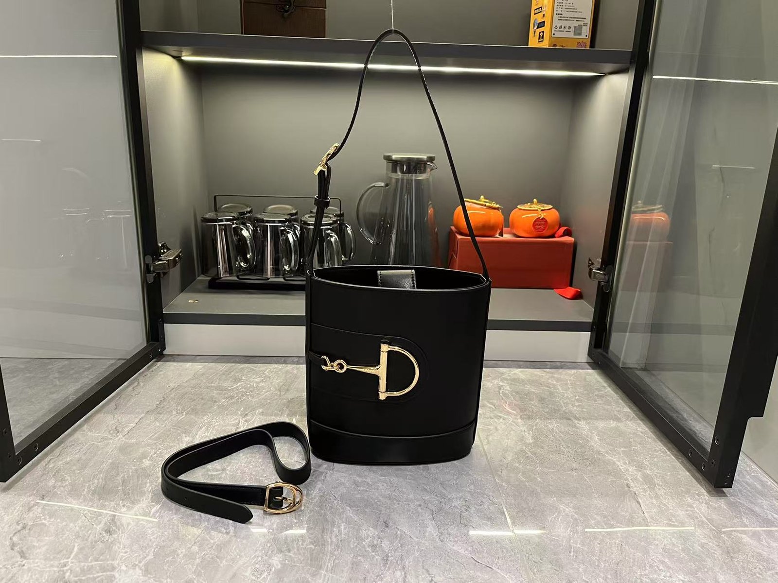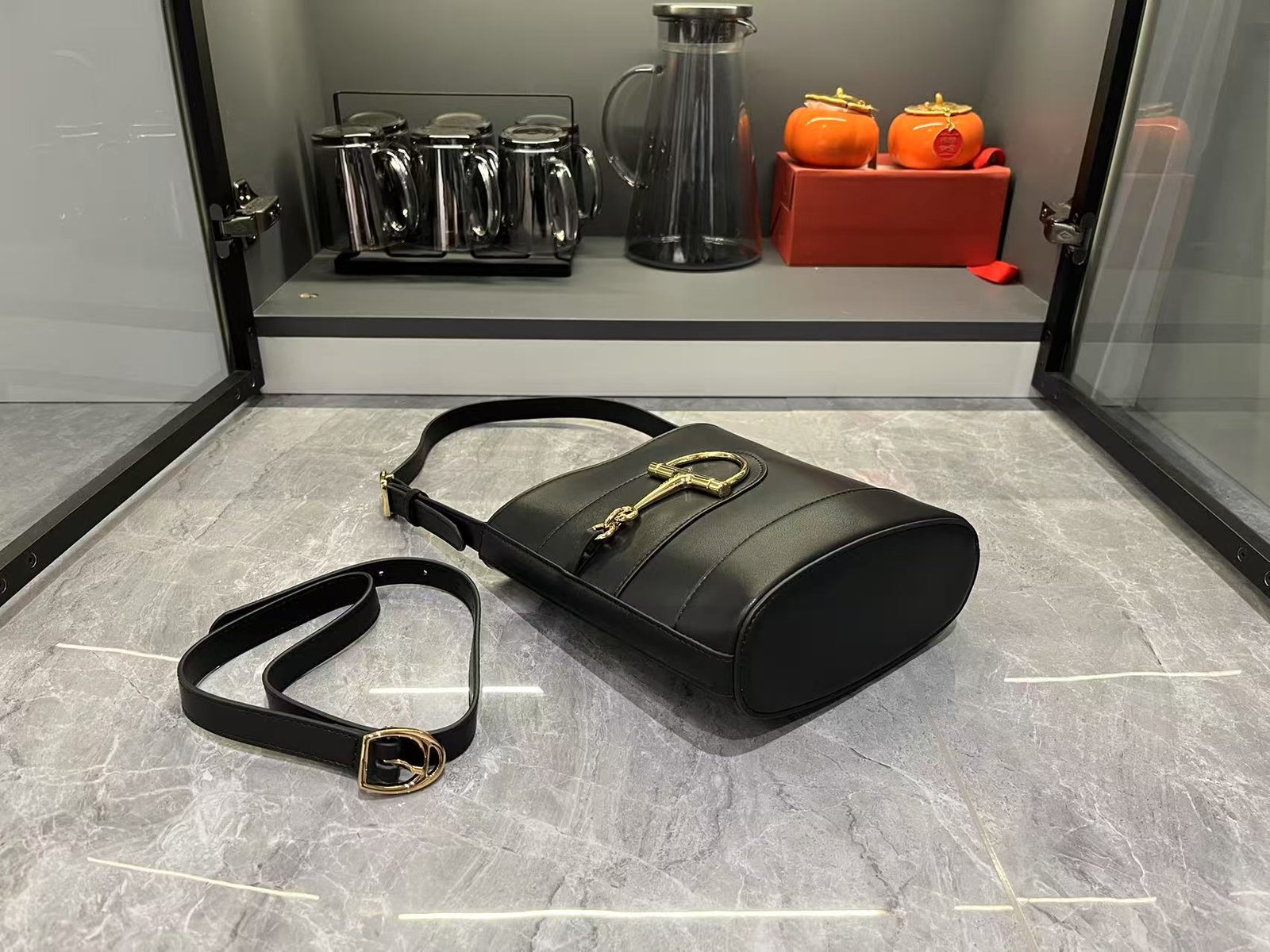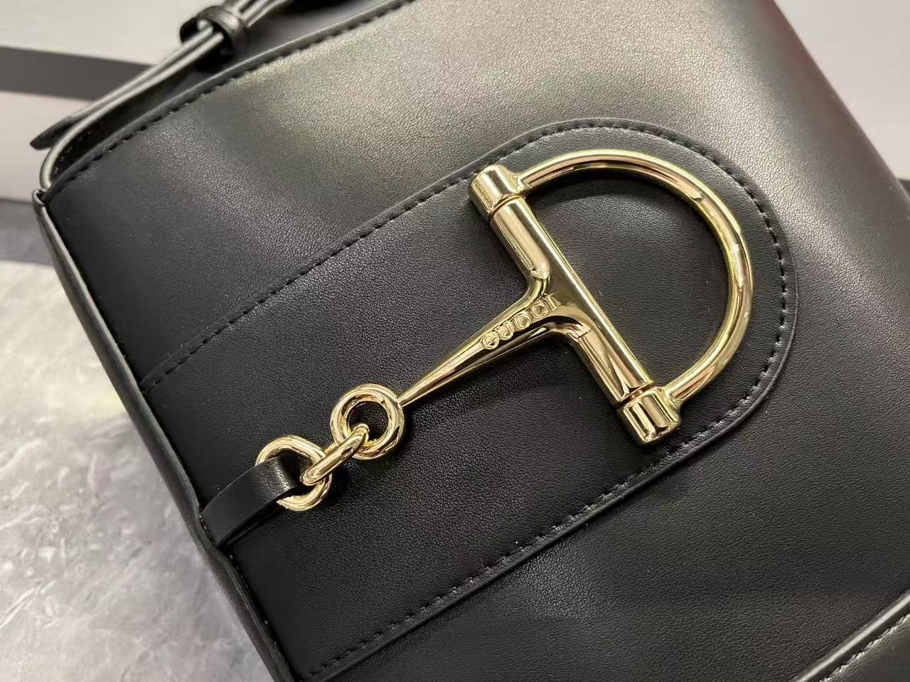 In the Spring/Summer 2025 collection, the GG73 series drew inspiration from a collector’s bucket bag launched in the same year as its collection name. This bag features a modern aesthetic interpretation of a horseneck buckle design accessory, which can be worn diagonally, over the shoulder, or as a handbag. It is made of smooth leather with a golden tone and an oversized half horseneck buckle design accessory, lined with a brown cotton linen blend.