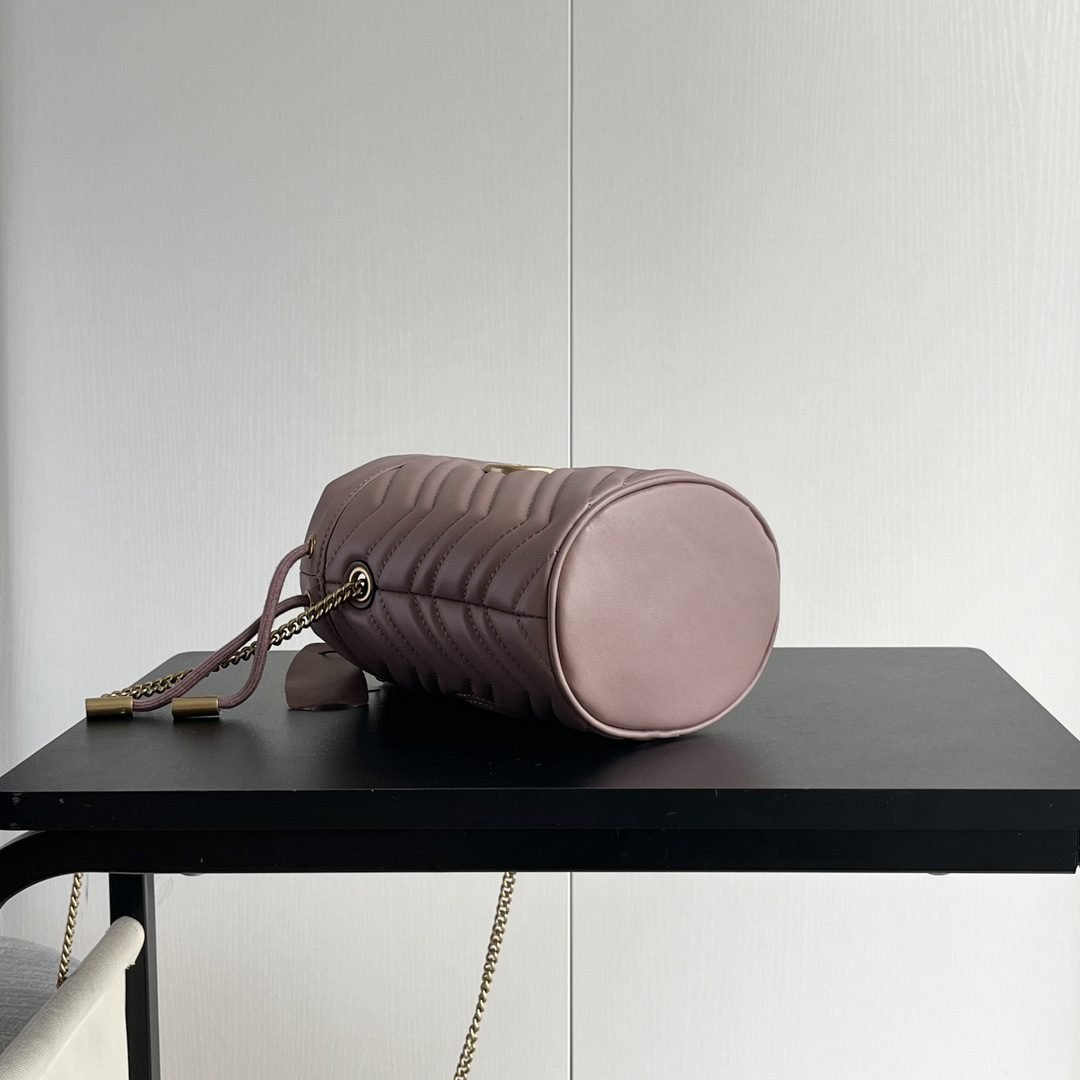 GG Marmont series mini bucket bag, with classic double-G shaped accessories on the front of the bag, chain shoulder strap and drawstring closure, can be used as a crossbody bag, size: 19cm (width) x 17cm (height)