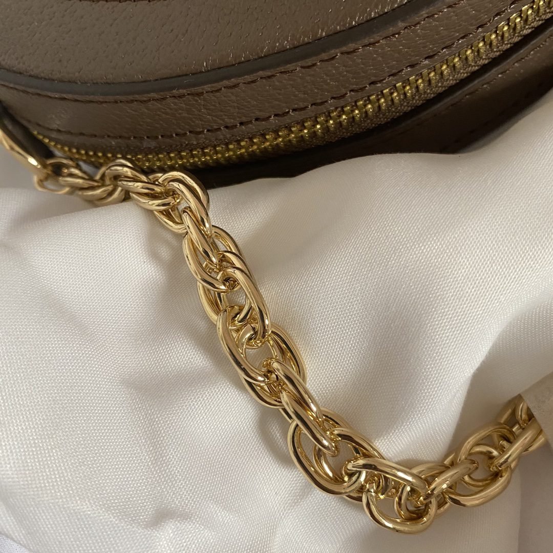 GG Ophidia series round cake is so cute, round shape + red and green webbing! Small and exquisite, can fit plus bag, this shoulder strap is chain with leather, size: 18*18*4.5