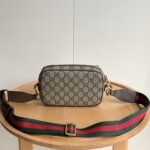 This series integrates two major collection details of woven straps and double G accessories, revitalizing creative styling and size design in the early autumn collection. This mini handbag is made of beige and ebony GG Supreme canvas, with gold accents adding eye-catching embellishments. Size: 20×12.5x9cm