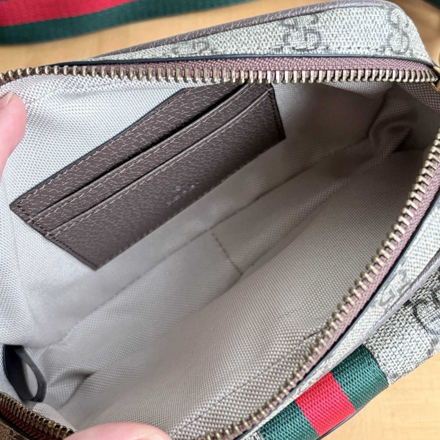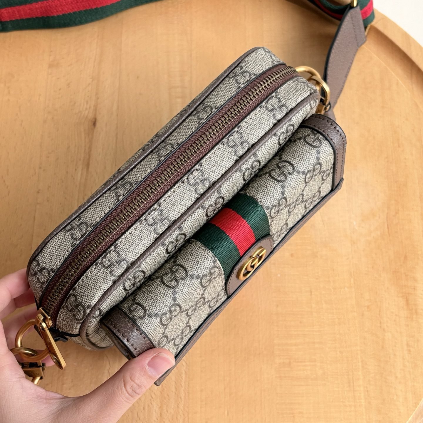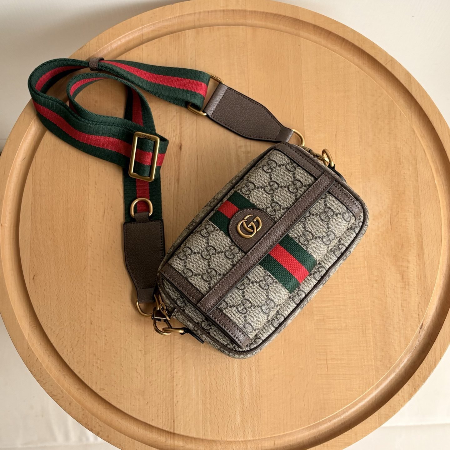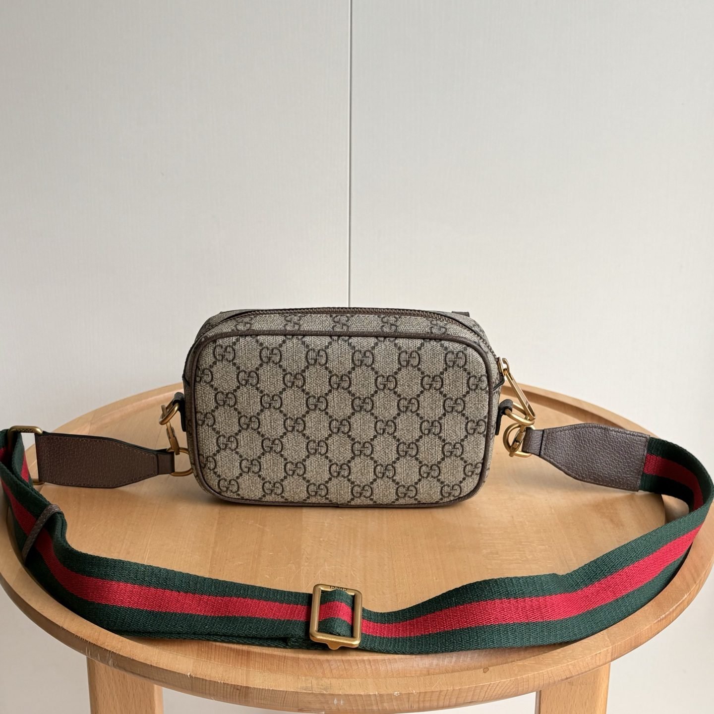 The all-new G Emblem series reinterprets the brand's timeless elegance and exquisite craftsmanship. This small shoulder bag embodies practical design aesthetics, with two main compartments lined with woven cotton fabric and a central zippered pocket., Beige and dark brown new G-letter pattern coated fabric, brown leather rolled edges, decorated with contrasting stitching, red and green woven cotton lining. Size: 25 (length) x 25 (height) x 15.5cm (thickness)