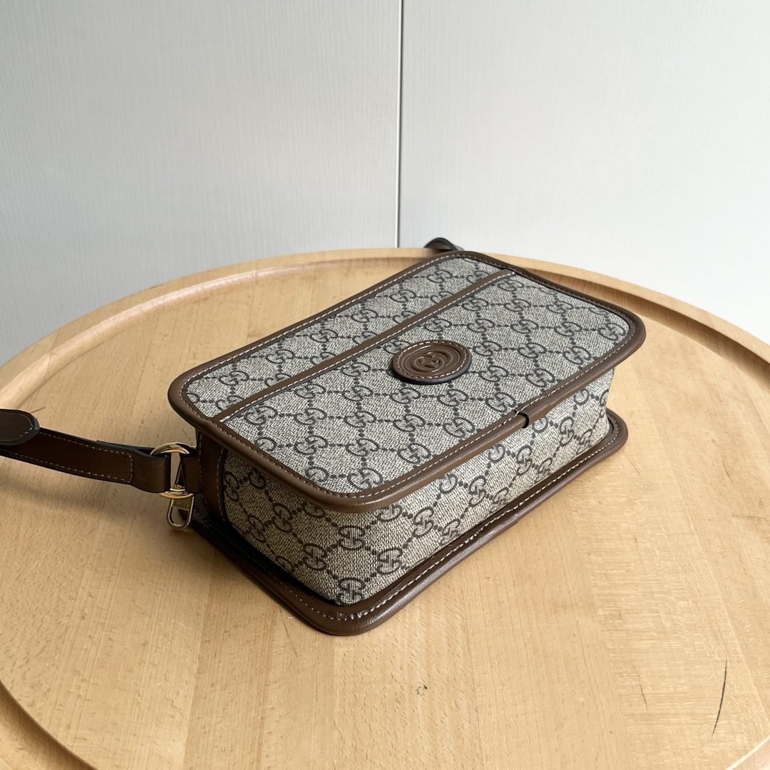 The all-new G Emblem series reinterprets the brand's timeless elegance and exquisite craftsmanship. This small shoulder bag embodies practical design aesthetics, with two main compartments lined with woven cotton fabric and a central zippered pocket., Beige and dark brown new G-letter pattern coated fabric, brown leather rolled edges, decorated with contrasting stitching, red and green woven cotton lining. Size: 25 (length) x 25 (height) x 15.5cm (thickness)