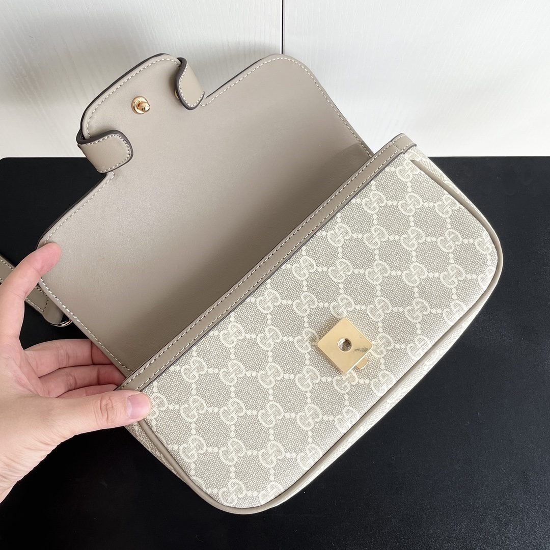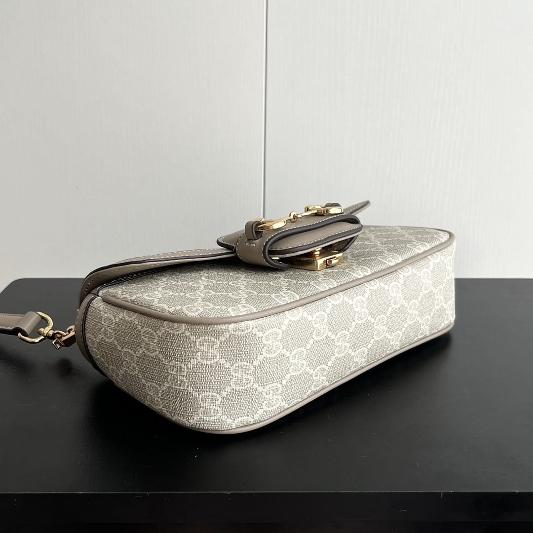 The new Horsebit 1955 series handbags embody the double-ring and elongated design that inherits the brand's equestrian roots. This small handbag is crafted from the brand-new GG canvas, featuring a unique hot embossing technique that renders exquisite patterns, creating a soft and refined touch. Dimensions: 22.6x12.7x5.6cm