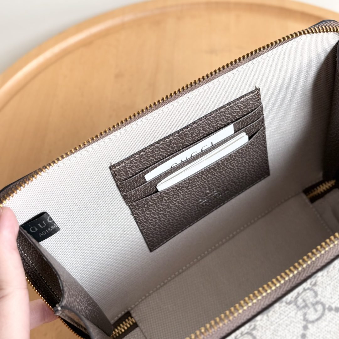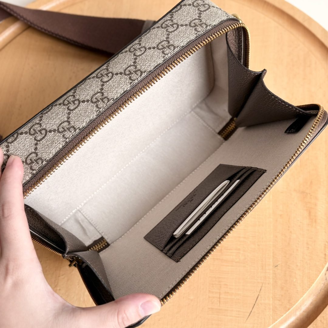 The all-new G Emblem series reinterprets the brand's timeless elegance and exquisite craftsmanship. This small shoulder bag embodies practical design aesthetics, with two main compartments lined with woven cotton fabric and a central zippered pocket., Beige and dark brown new G-letter pattern coated fabric, brown leather rolled edges, decorated with contrasting stitching, red and green woven cotton lining. Size: 25 (length) x 25 (height) x 15.5cm (thickness)