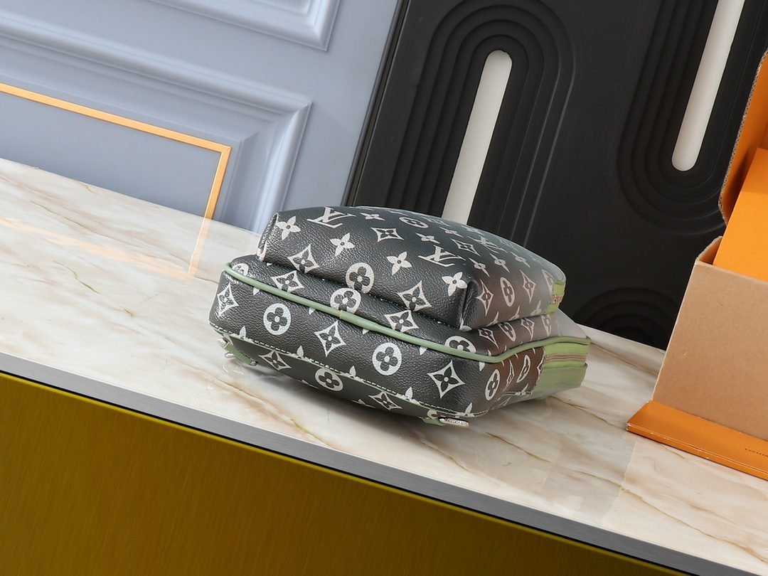 This Avenue slingbag bag is made of Monogram Green gradient canvas with the Monogram pattern fading into the background. The color and delicate gradient convey a sense of sophistication. This compact crossbody bag has a main compartment and an exterior zippered pocket, as well as a triangular zippered pocket with a strap to the bag