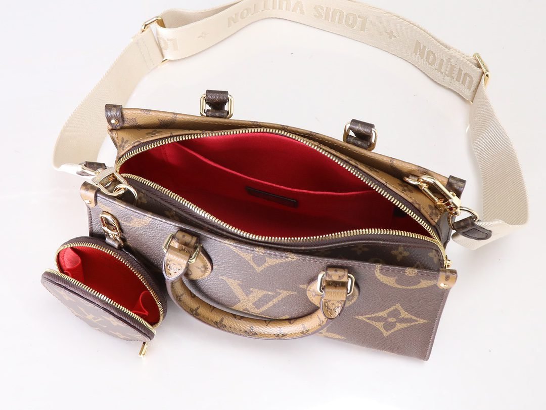 The OnTheGo tote is a fusion of Giant Monogram and Monogram Reverse canvas that reinvents the ample East West silhouette. Detailed with a removable round coin pocket, the Toron top handle and removable wide shoulder strap allow for multiple carrying options. 25.0 x 13.0 x 10.0 cm (L x H x W)