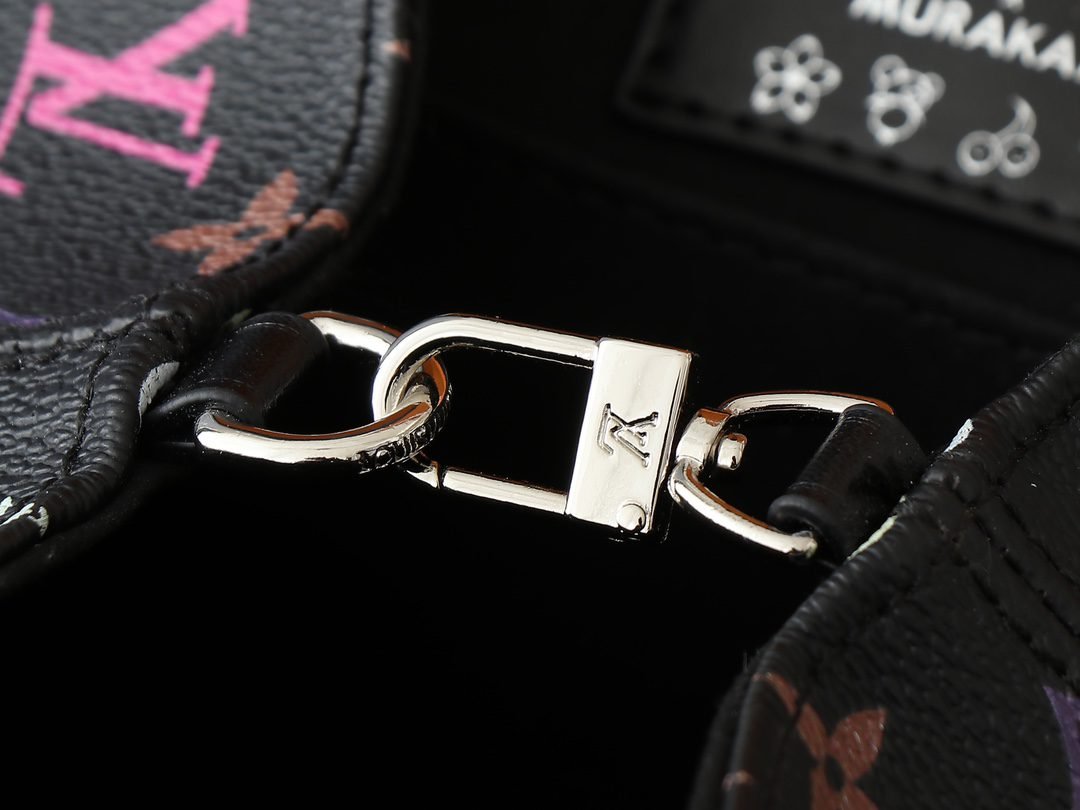 From the Louis Vuitton x Takashi Murakami reissue collection, the Neverfull medium bag is crafted from Monogram canvas in a spacious silhouette with a dynamic Monogram floral motif that reflects the artist’s “ultra-flat” aesthetic. Cowhide leather outlines the top edge, handles and side straps, while a fabric lining with colorful stripes, zippered interior pockets and a removable organizer complete the functional design. Dimensions: 31.0 x 28.0 x 14.0 cm (L x H x W)