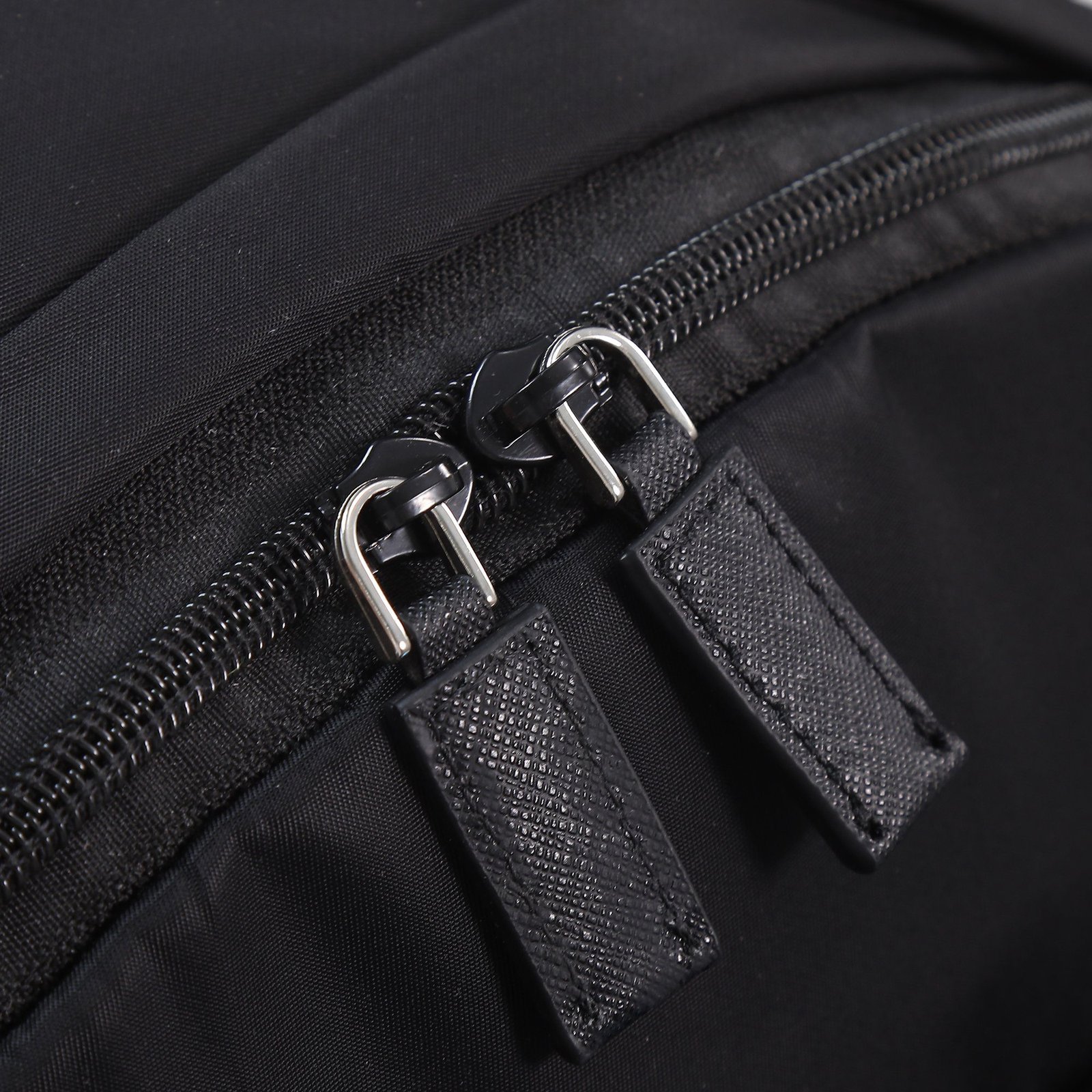 This backpack is outlined with imported Saffiano leather trim, presenting modern minimalist lines. It is made of imported nylon fabric and cross patterned cowhide, with top-grade polished metal hardware. The back pad design is very comfortable and can be placed on a suitcase. The functional design of the grid layer is excellent.   size Length: 31x Height 43.5X Bottom 20cm