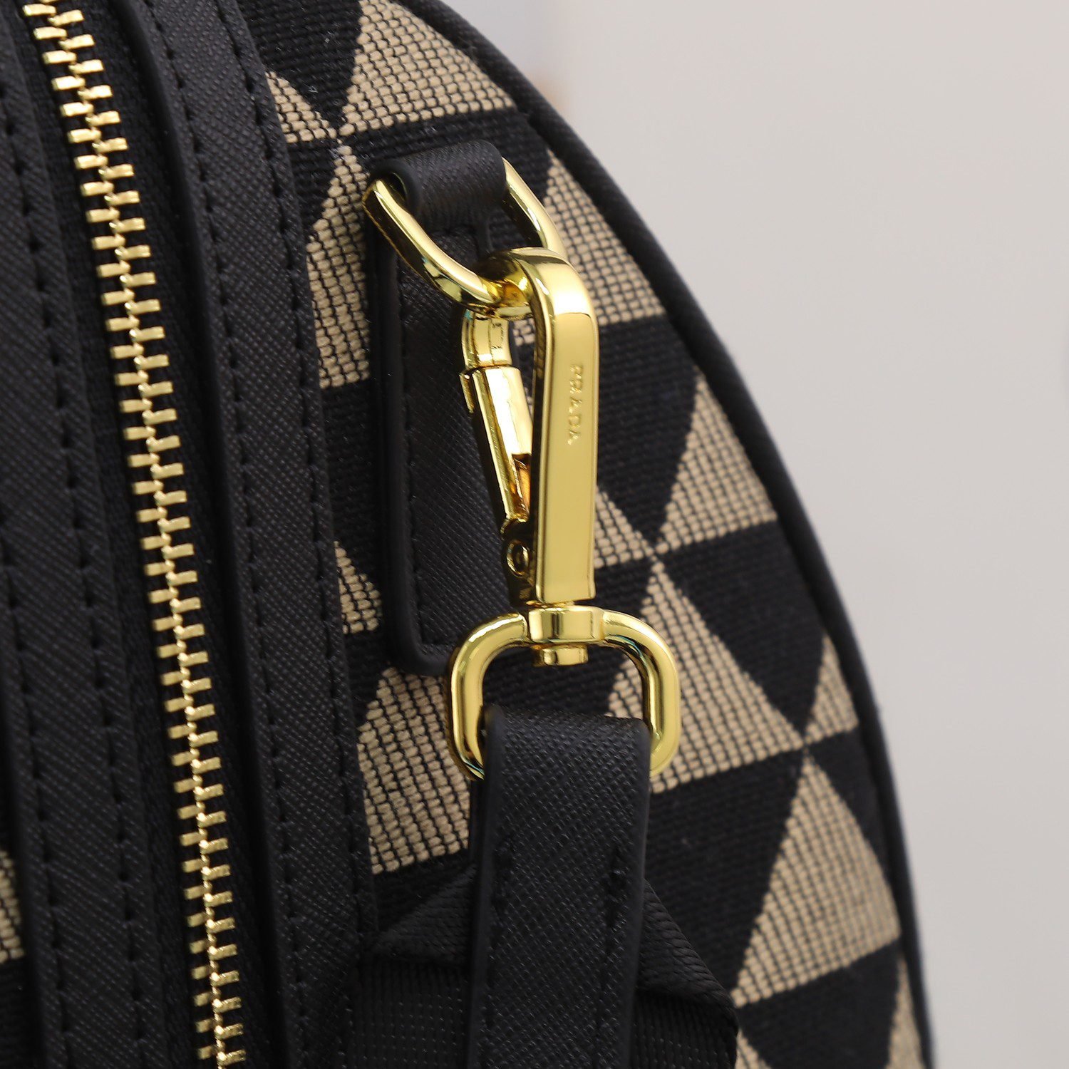 This product is made of imported nylon material and Saffiano leather rolled edges, with adjustable fabric shoulder straps and stainless steel accessories. The upgraded version is designed with a detachable small bag on the shoulder strap, a triangular enamel logo nameplate, zipper and buckle closure, two outer pockets, one flip zipper pocket, and two inner pockets. It is lightweight and practical, with dimensions of 25 x 22 x 10