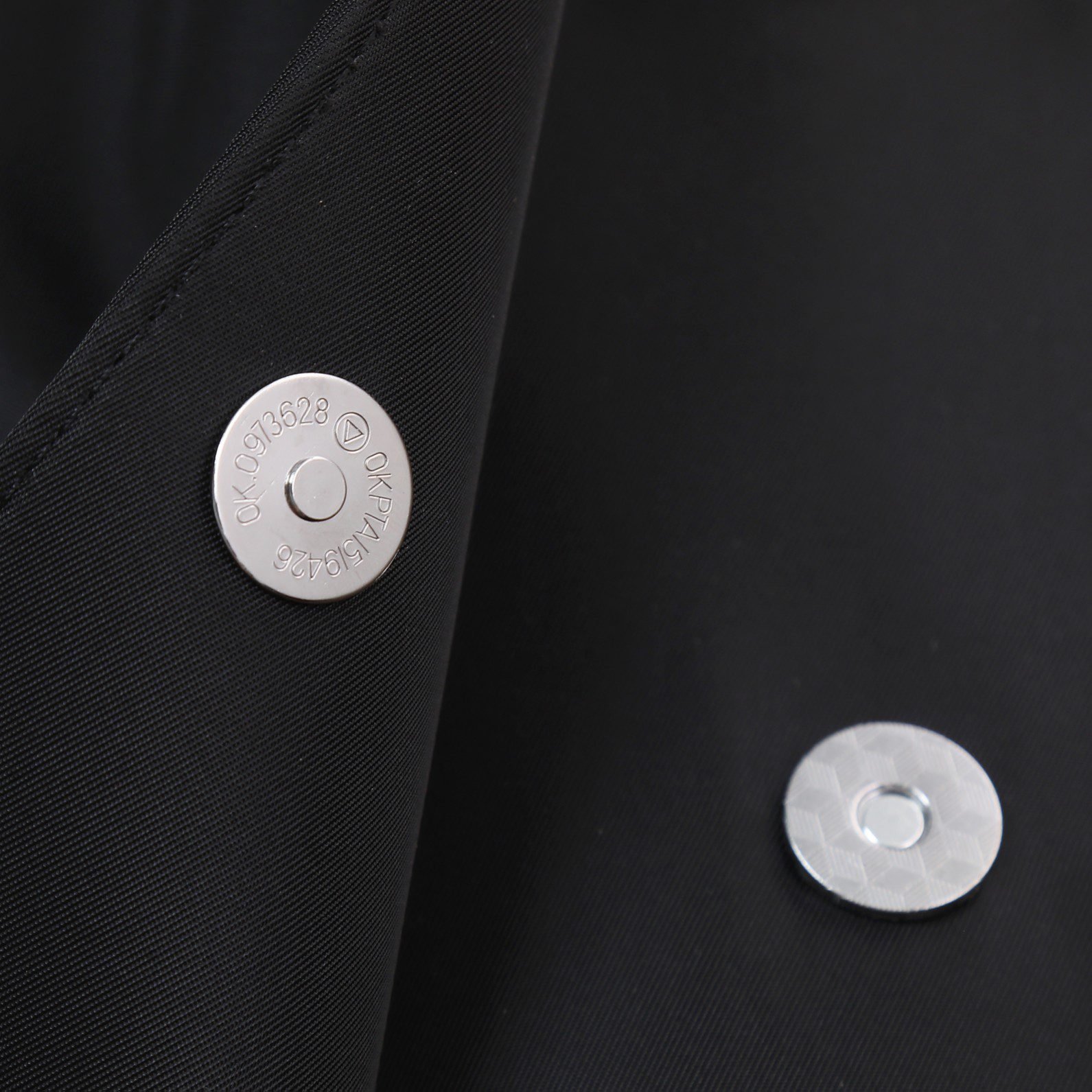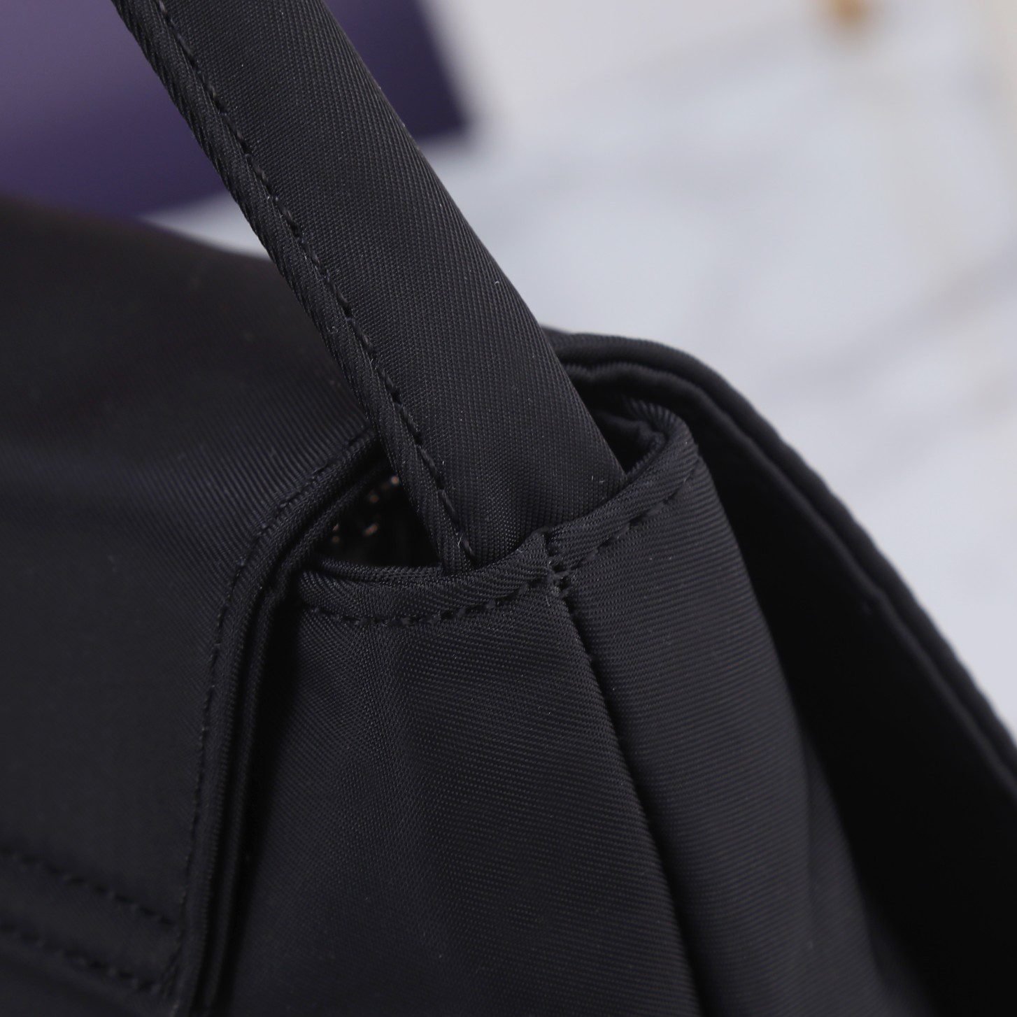 This product is made of imported nylon material and Saffiano leather rolled edges, with adjustable fabric shoulder straps and stainless steel accessories. The upgraded version is designed with a detachable small bag on the shoulder strap, a triangular enamel logo nameplate, zipper and buckle closure, two outer pockets, one flip zipper pocket, and two inner pockets. It is lightweight and practical, with dimensions of 25 x 22 x 10