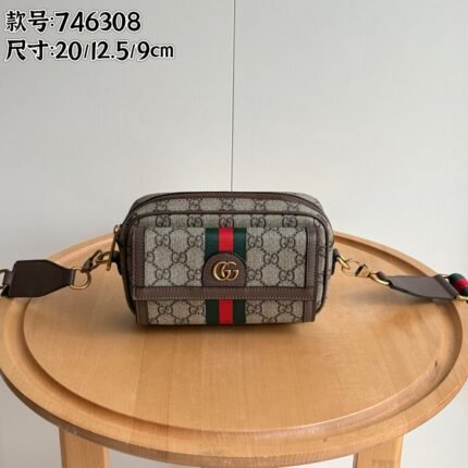 Ophidia series presents eye-catching new works with ingenuity This series integrates two major collection details of woven straps and double G accessories, revitalizing creative styling and size design in the early autumn collection. This mini handbag is made of beige and ebony GG Supreme canvas, with gold accents adding eye-catching embellishments. Size: 20x12.5x9cm