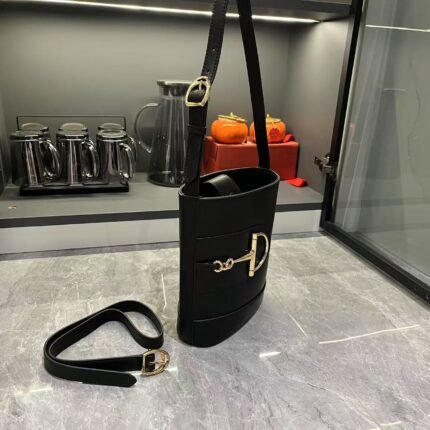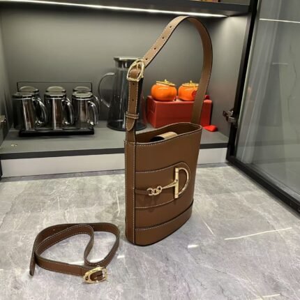 GG 73 series bucket bag In the Spring/Summer 2025 collection, the GG73 series drew inspiration from a collector's bucket bag launched in the same year as its collection name. This bag features a modern aesthetic interpretation of a horseneck buckle design accessory, which can be worn diagonally, over the shoulder, or as a handbag. It is made of smooth leather with a golden tone and an oversized half horseneck buckle design accessory, lined with a brown cotton linen blend. Size: 18.5x 20x 8.5cm